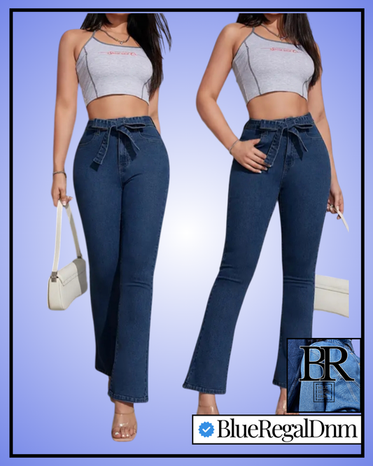 BlueRegalDnm® Women's High-Elasticity Stretchy Denim Flare Jeans with Tie Belt - Blue